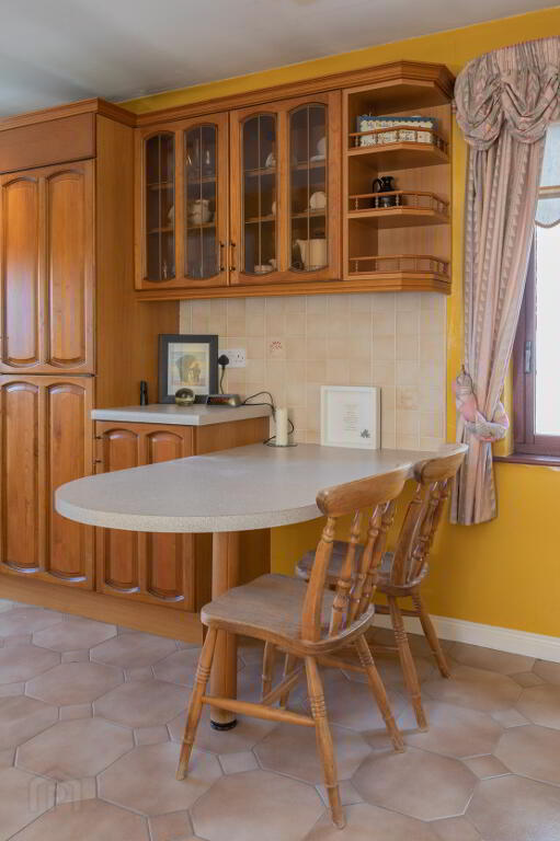 Fully fitted kitchen with an excellent range of high and low level units; integrated fridge freezer; integrated dishwasher; formica work surfaces; integrated oven, ceramic hob and extractor fan; tiled floor; tiled splashback; 1 ½ bowl stainless steel sink unit; breakfast bar seating area