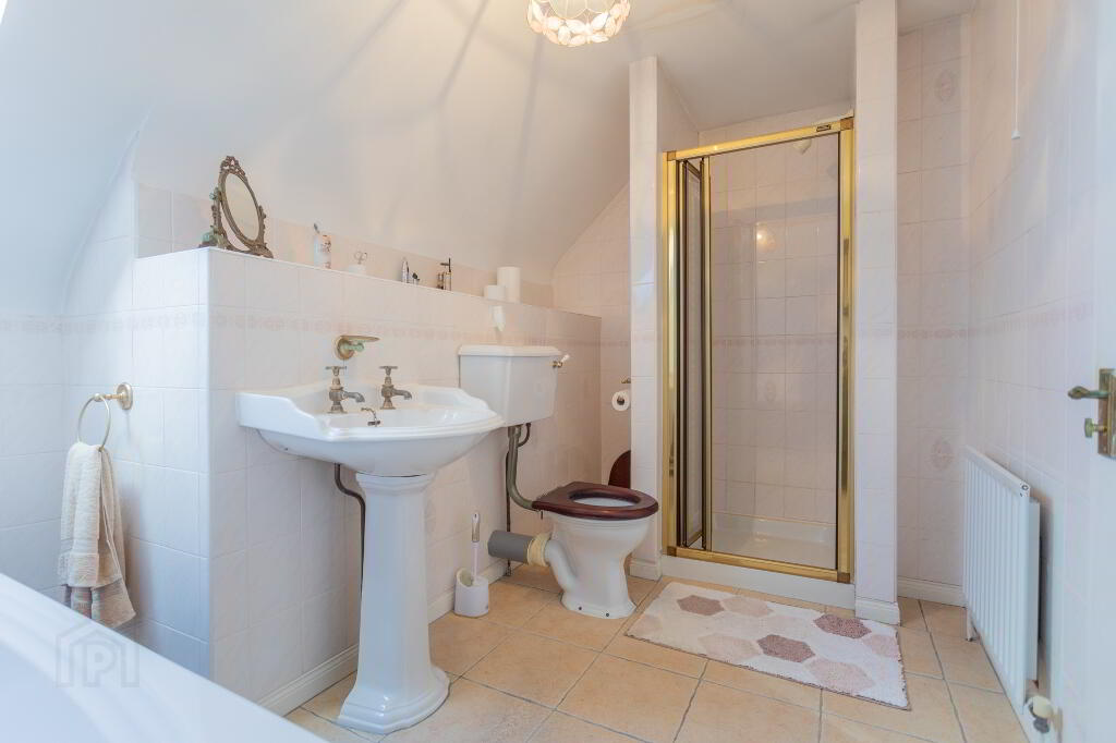 Luxury fitted white suite comprising of low flush W.C; wash hand basin; tiled shower cubicle; panelled bath; tiled floor and walls; velux window