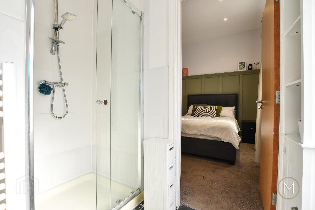 On the ground floor the accommodation comprises of an entrance hallway, a bright and spacious living room with wood burning stove and French style glazed doors which lead to a fantastic open plan kitchen with dining area. The kitchen is finished with a range of painted units, brass fittings and a standout white ceramic sink with brass mixer tap and is fully complemented with a range of built in appliances. From the dining area, there are glazed double doors which lead out directly onto a beautiful brick pavior patio and additional garden area. From the kitchen too is all important downstairs loo!