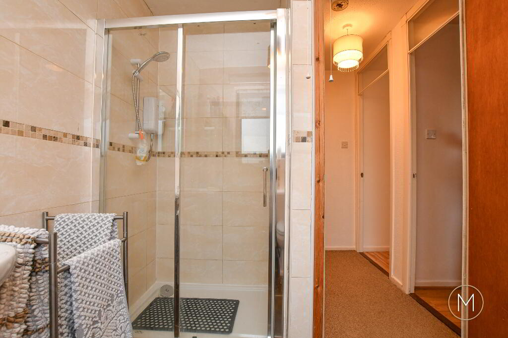 Attractive white suite comprising of tiled shower cubicle with electric shower; low flush W.C; wash hand basin; tiled floor and walls