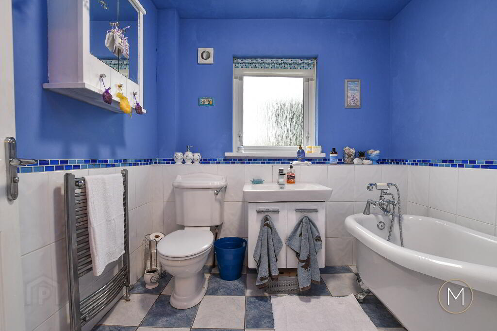 The property boasts four bedrooms, with the master bedroom benefiting from an ensuite bathroom. The main family bathroom is partially tiled and features a free standing bath tub.